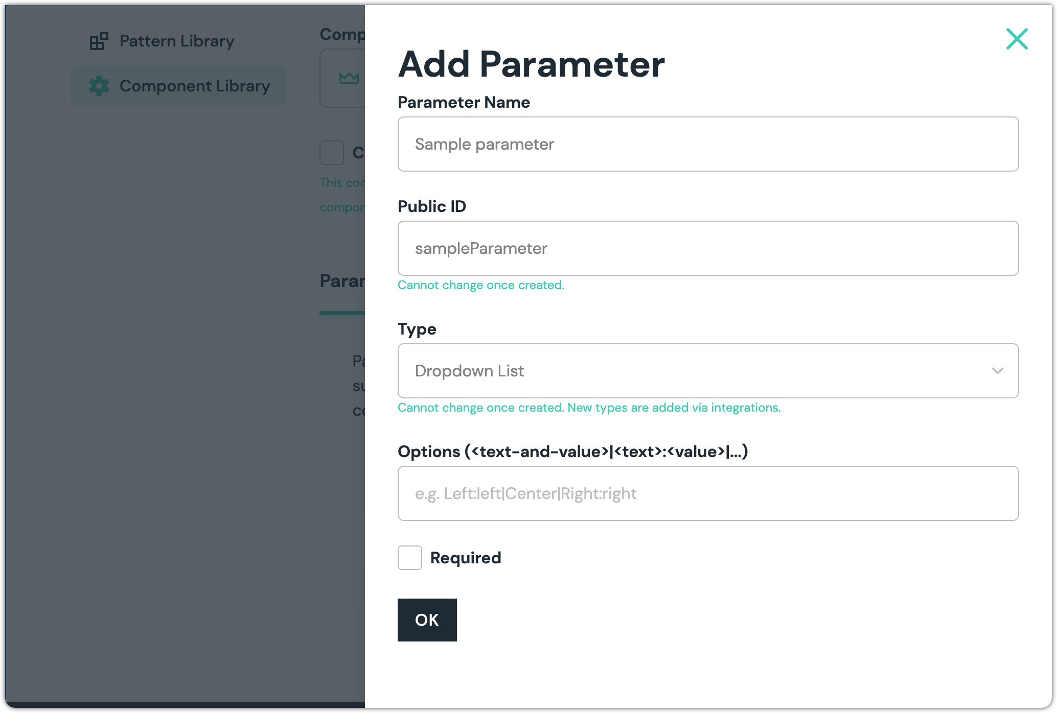When you create a custom integration, you may want to allow the Canvas user who is adding the parameter to a component to be able to configure some additional settings. The parameter configuration location allows you to add form fields between the Type field and the OK button.