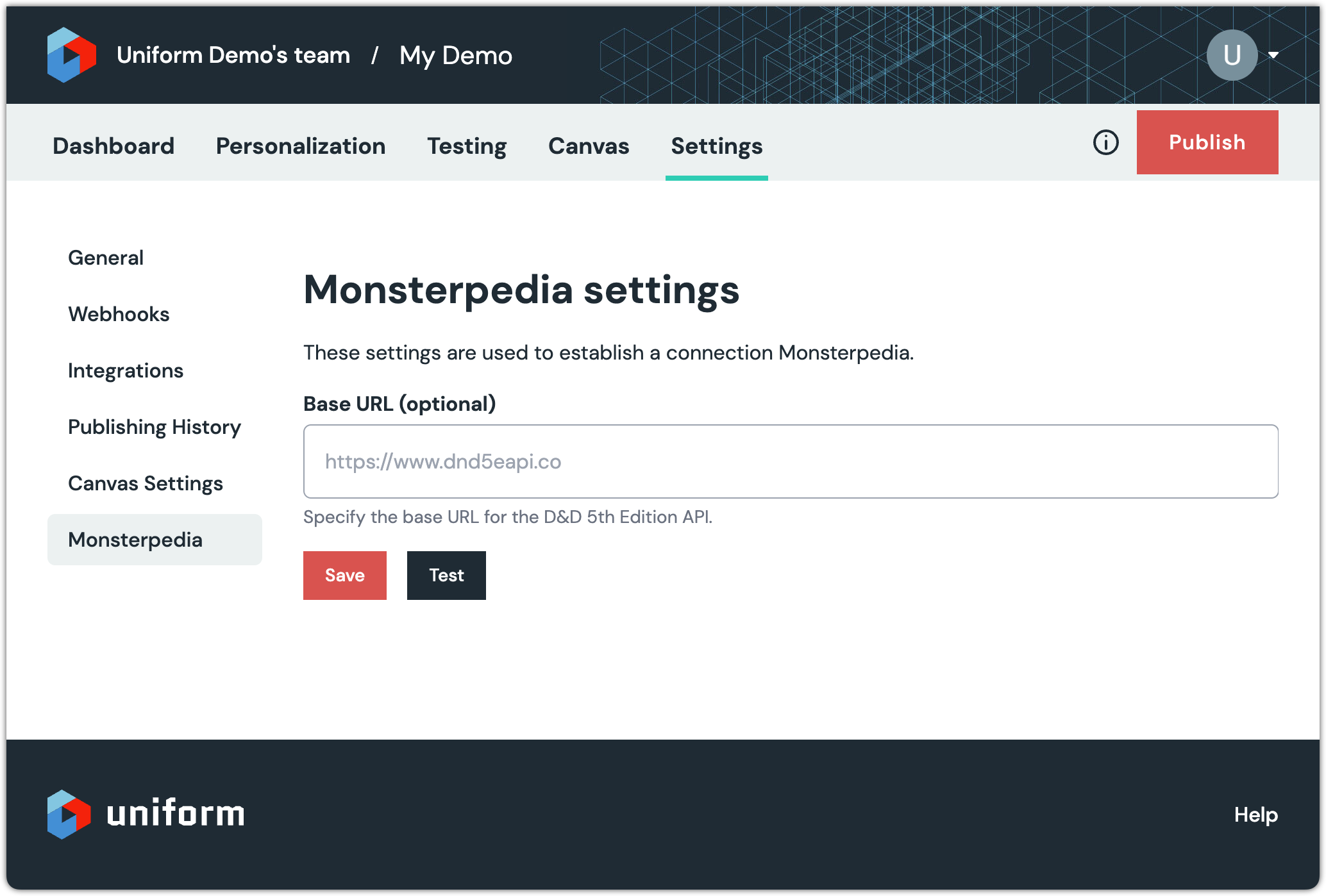 Uniform administrator can configure a connection to a specific API endpoint that provides information about monsters, and test that the endpoint is active.