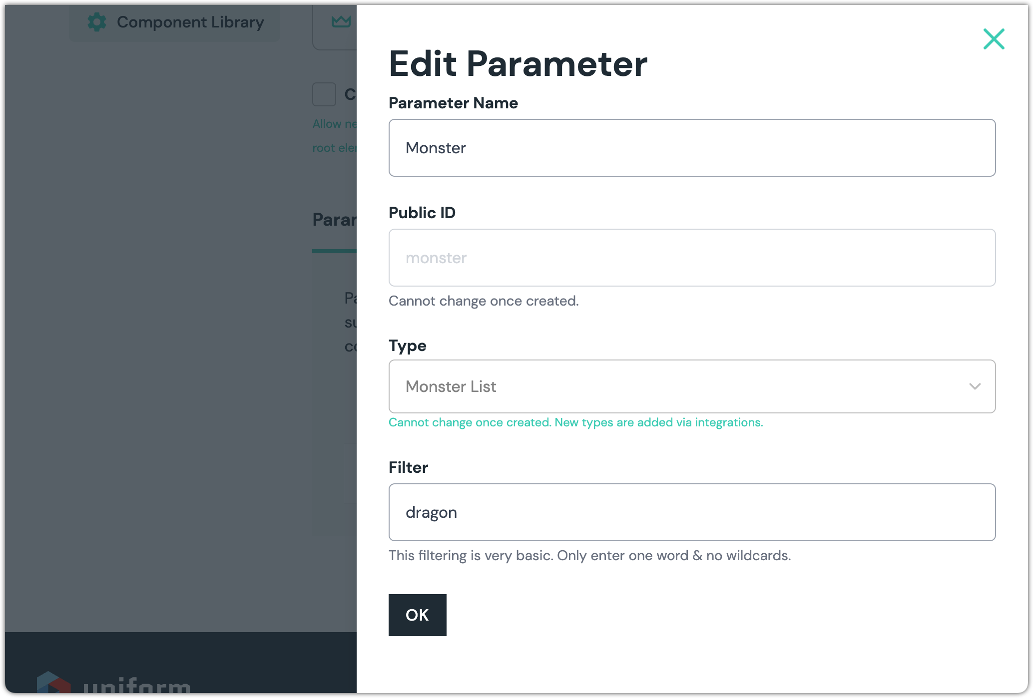 Canvas designer can add a parameter to a component that enables a Canvas editor to select a monster. The Canvas designer can also configure a filter that limit the monsters that are available for the editor to select from.