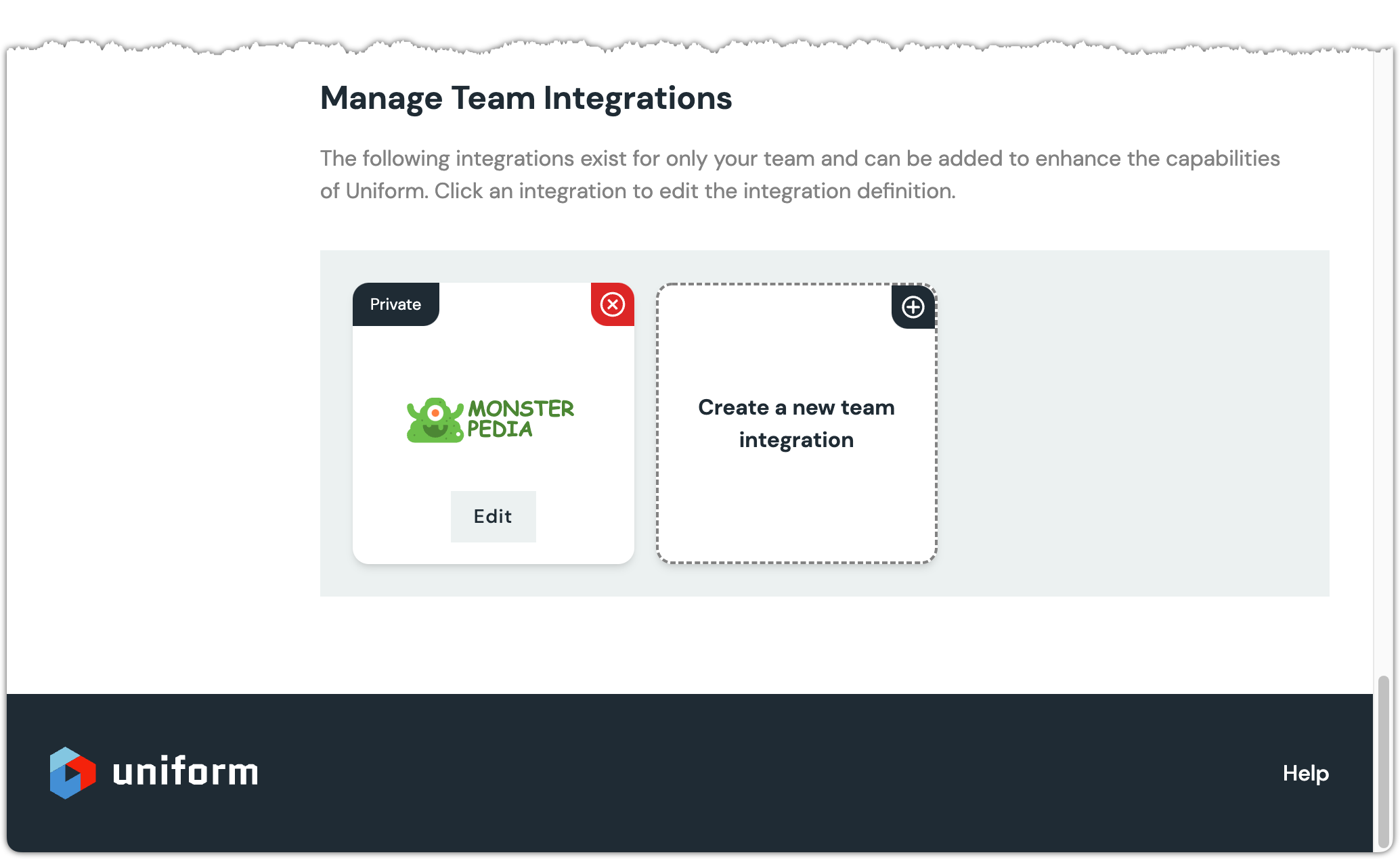 Registering the custom integration in Uniform enables Uniform to incorporate the integration into the Uniform dashboard. The values you use differ slightly depending on where the configuration app runs.