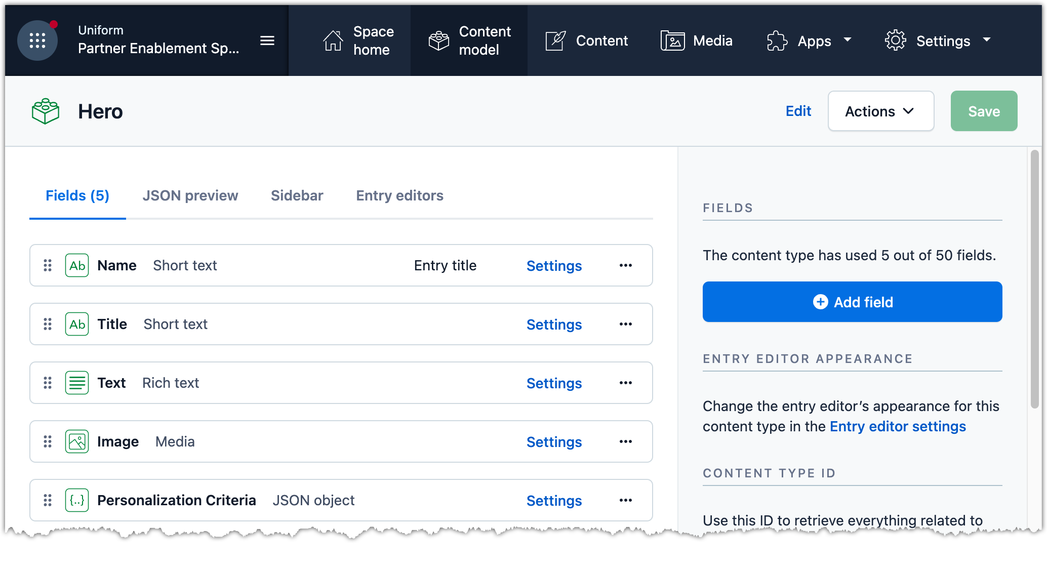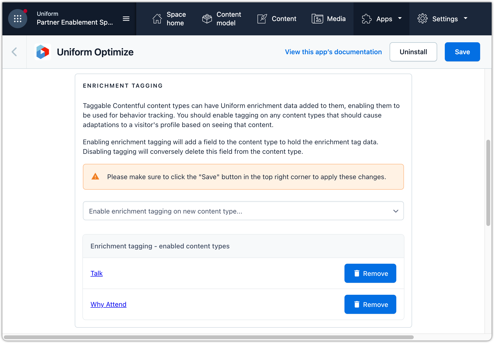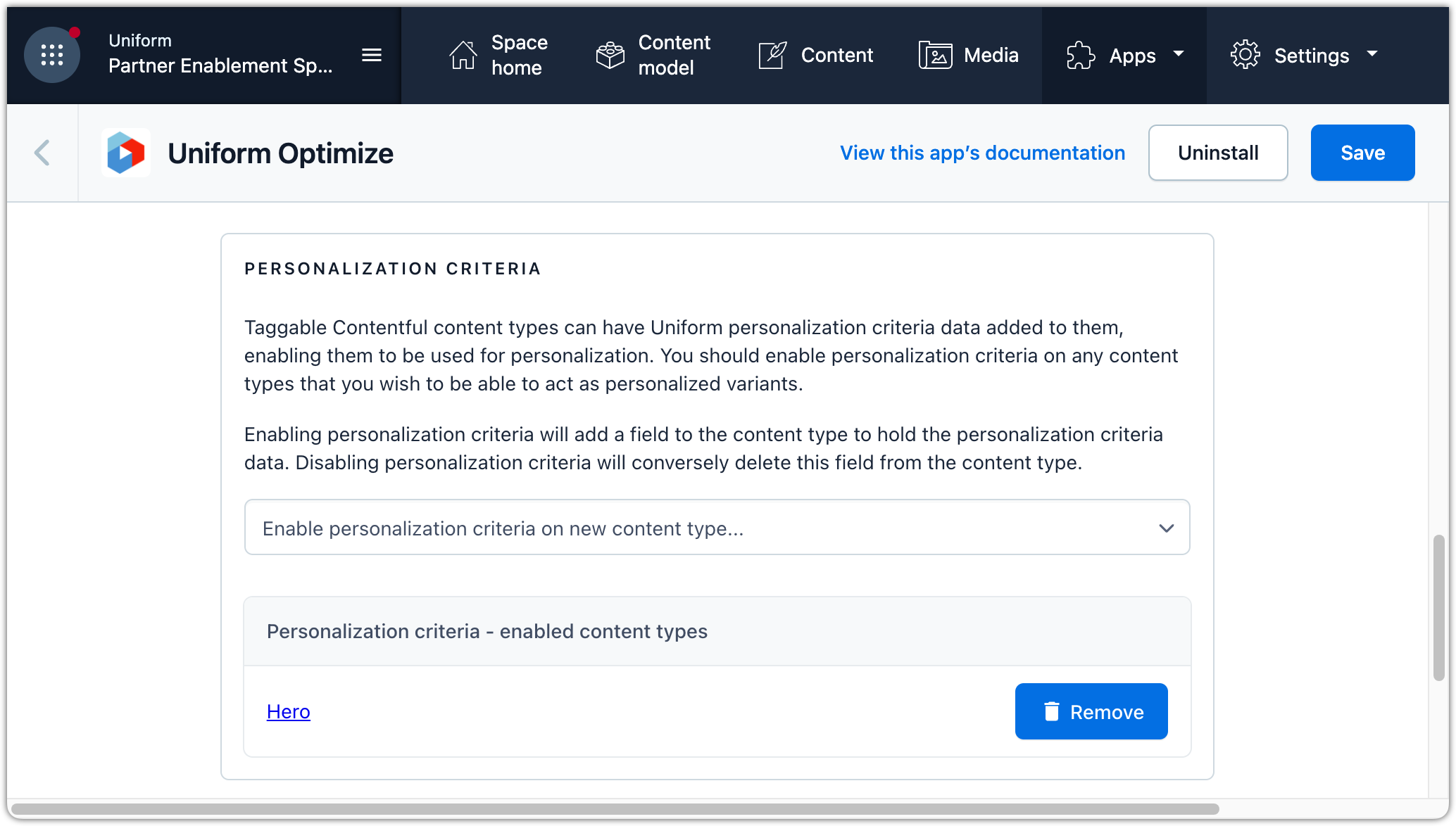 The Uniform app in the Contentful Marketplace adds a number of custom field types that allow content authors to configure personalization during the content authoring process. You must add this app to your space.