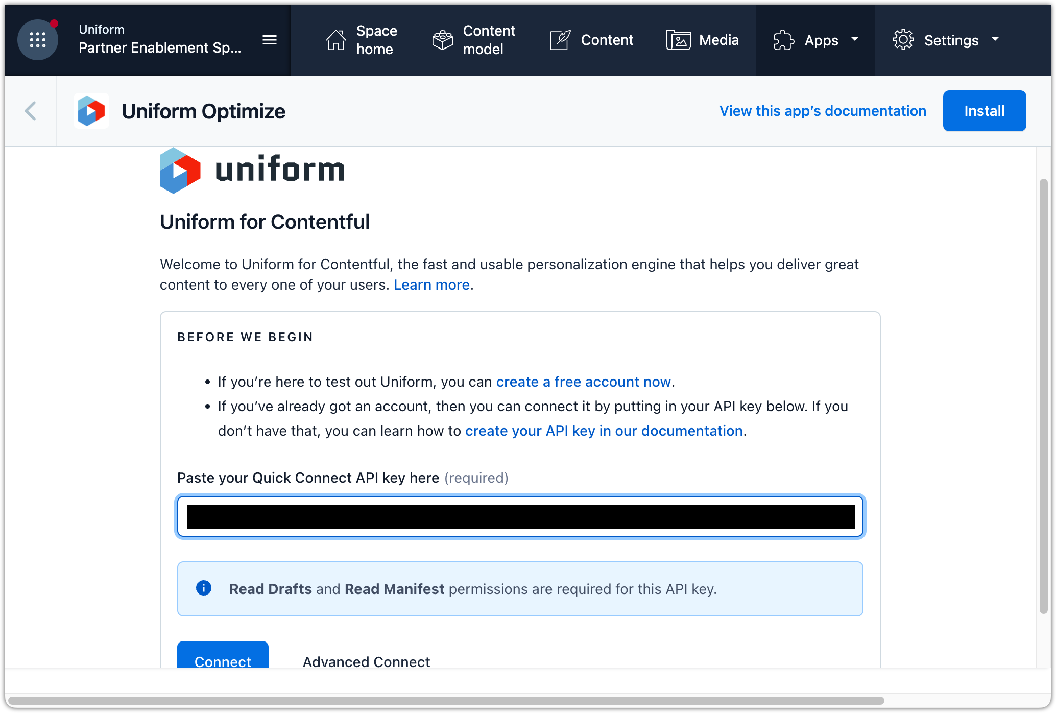 You need the Quick Connect API key from Uniform to configure the Uniform app in Contentful.