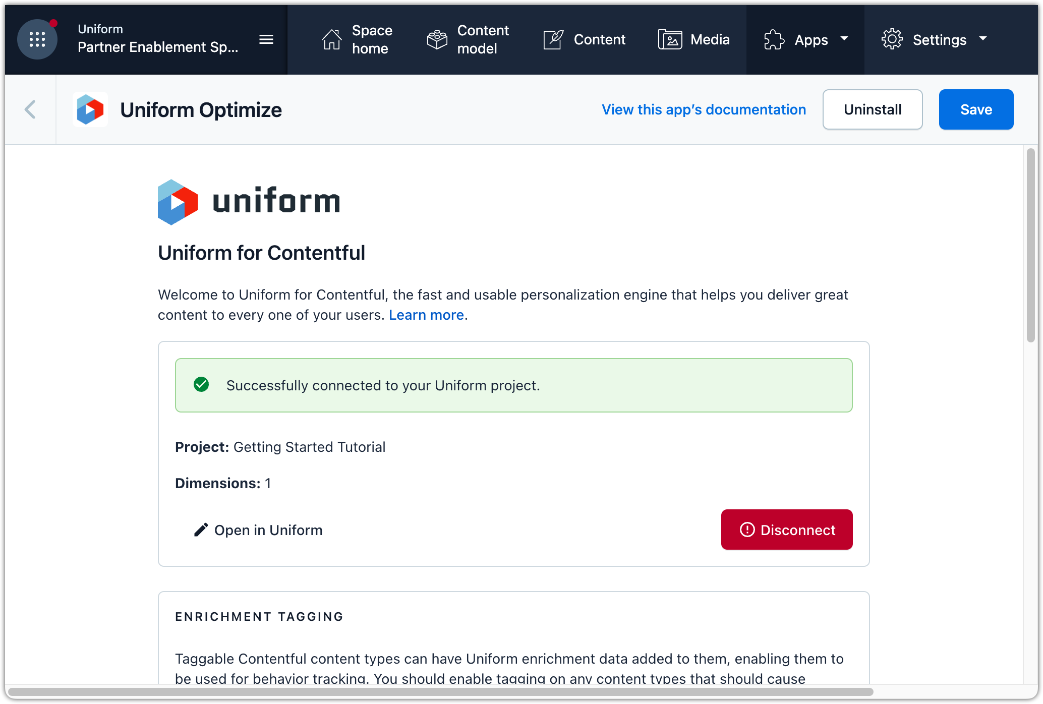 The Uniform app in the Contentful Marketplace enables content managers to use Uniform capabilities within the Contentful user interface.