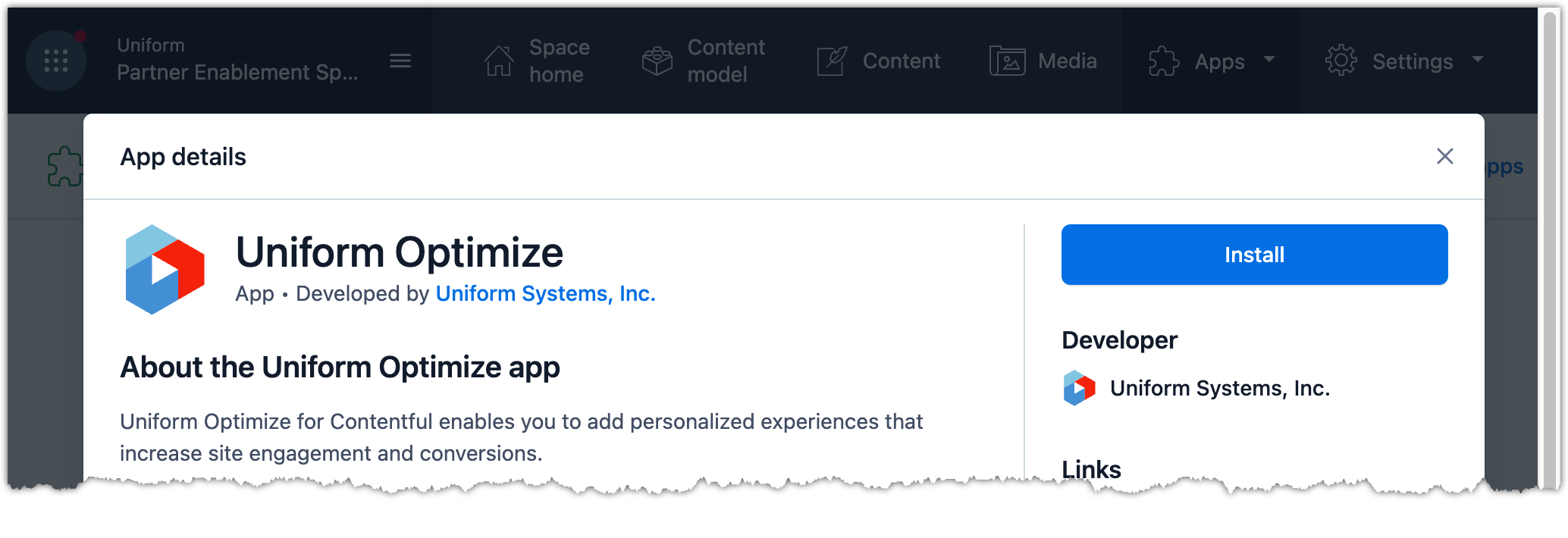 This section guides you through the process of adding the Uniform app from the Contentful Marketplace to your Contentful space.