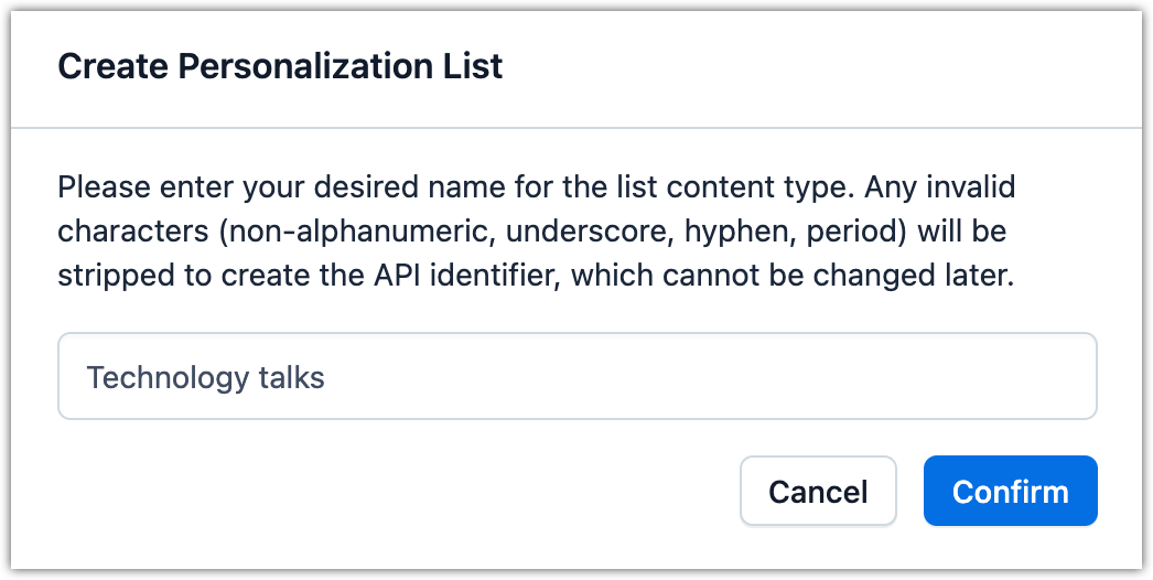 A personalization list is a special type of content type that the Uniform app creates. Once the content type is created, you use it to create entries like any other content type.
