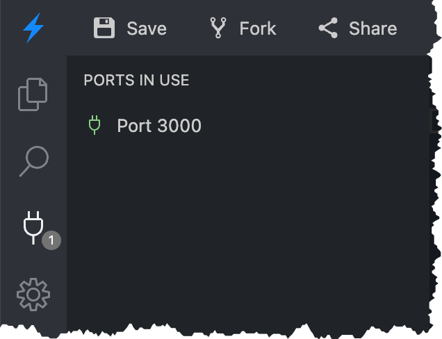 .envfile should cause the container to restart. If it doesn't, enter the following command in the Stackblitz terminal:npm run devIn the activity bar the plug icon indicates that 1 port is in use. Click this icon.