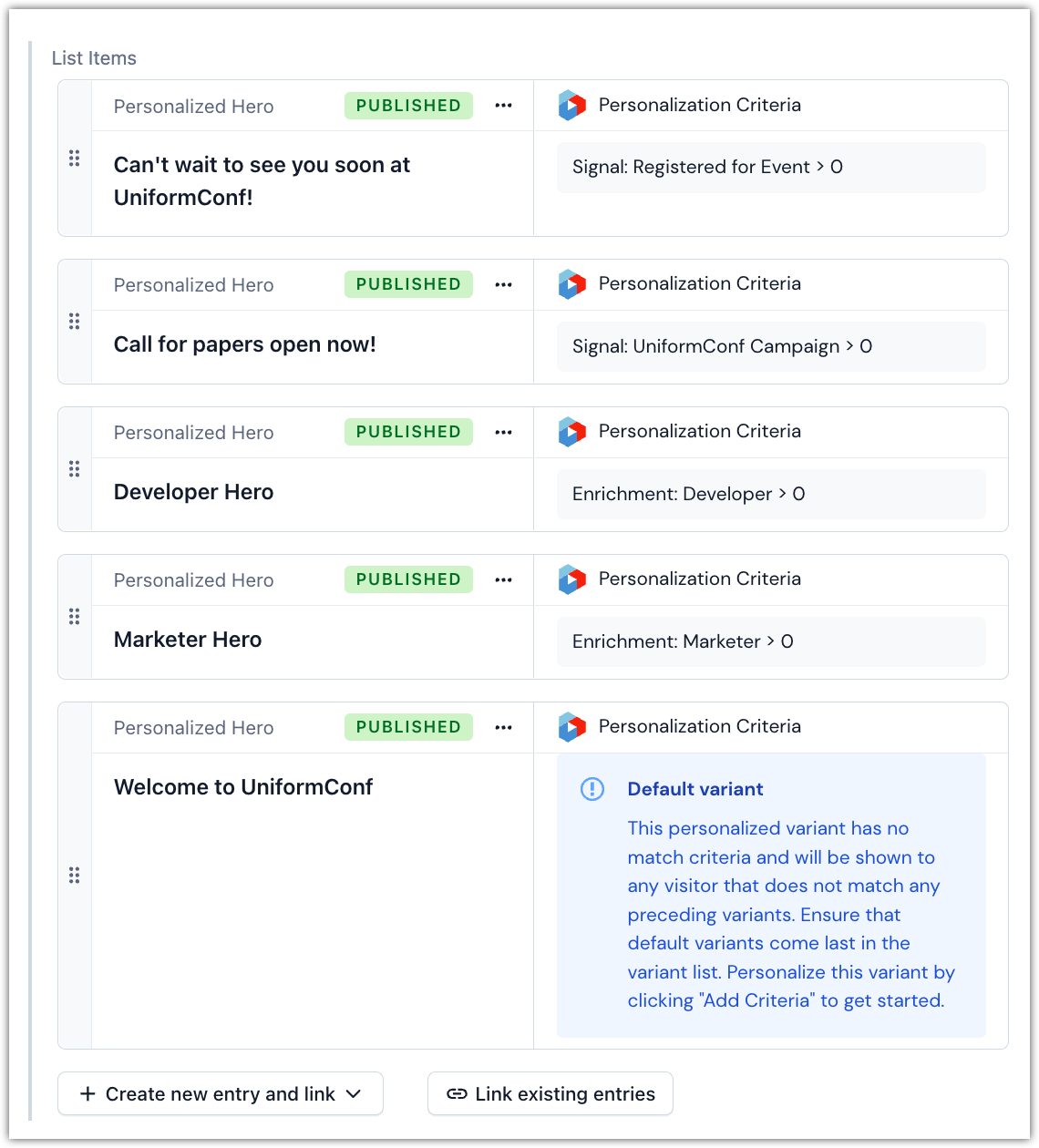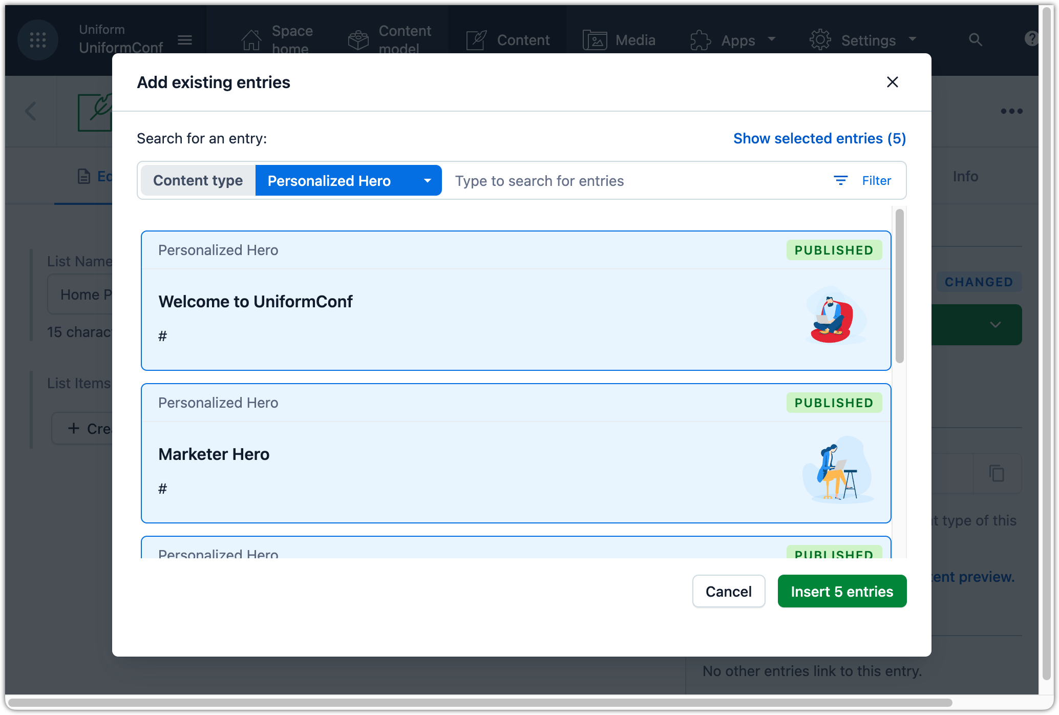 - Configure a content entry for the list of Personalized Hero entries for the home page.