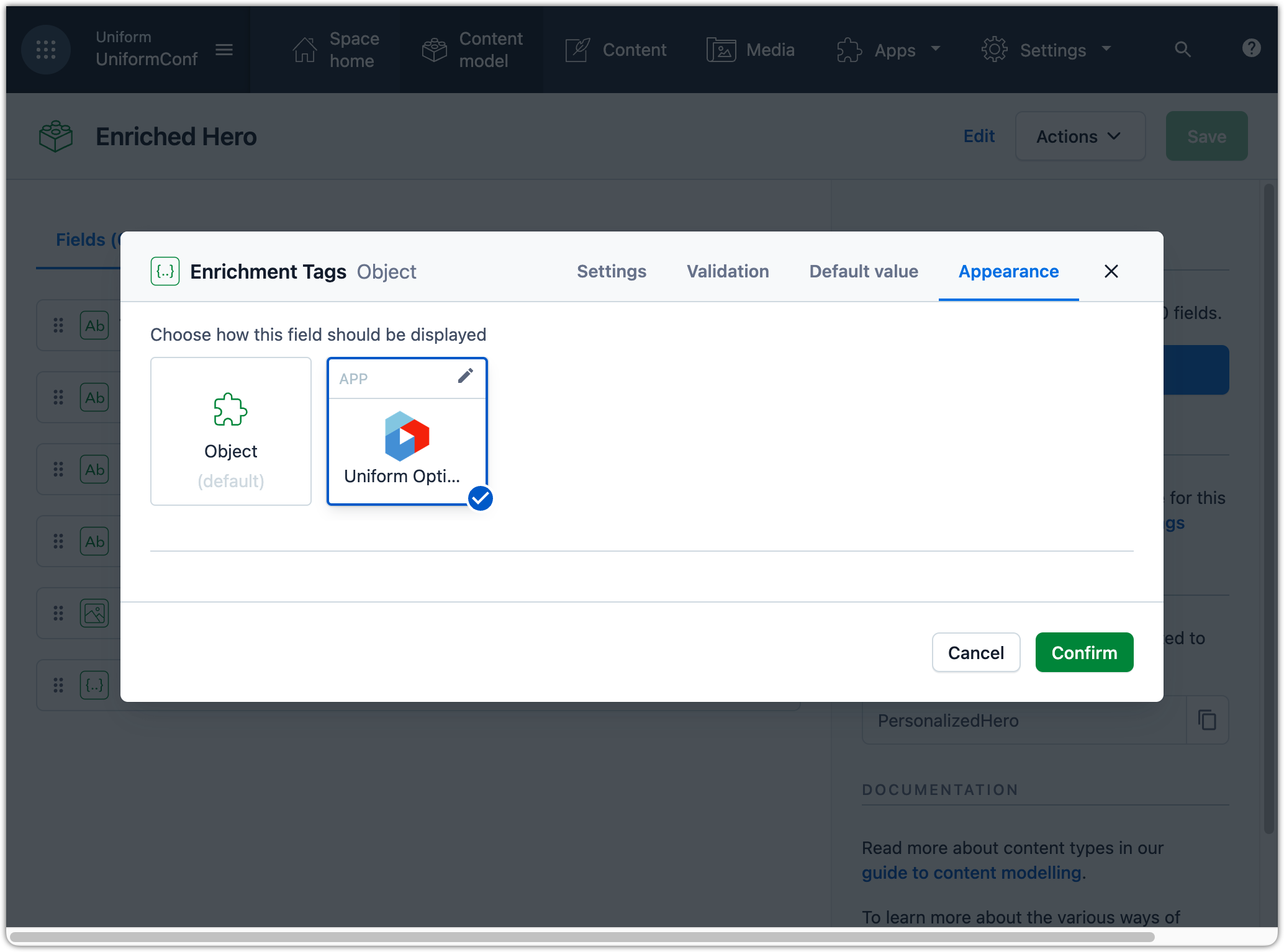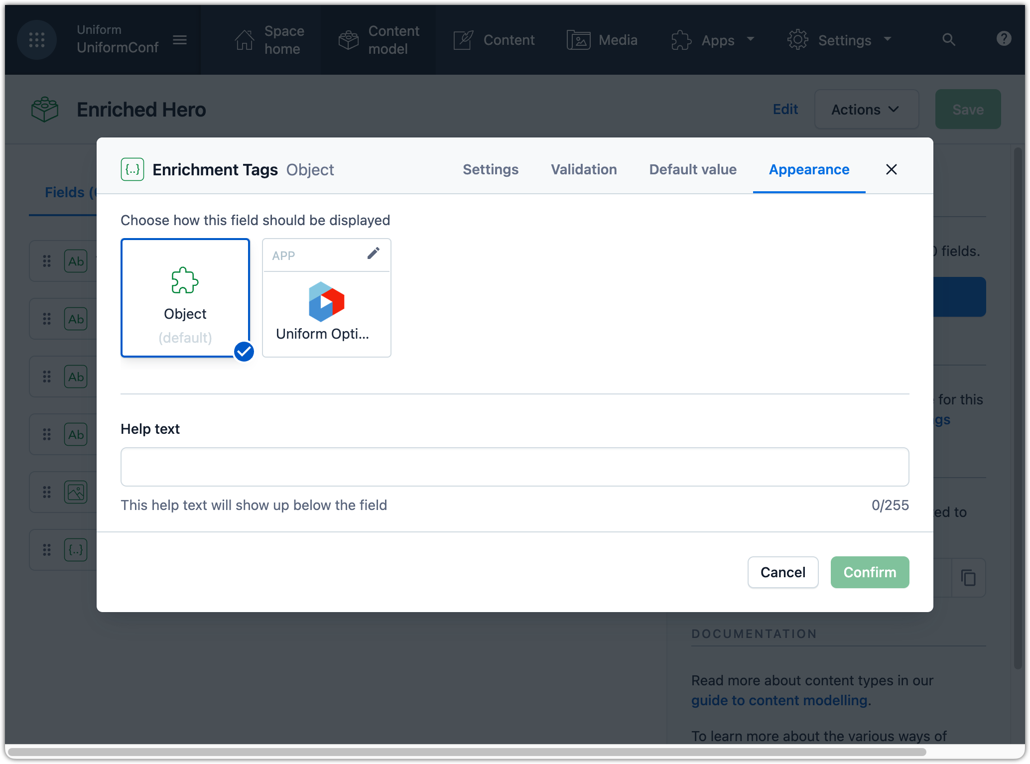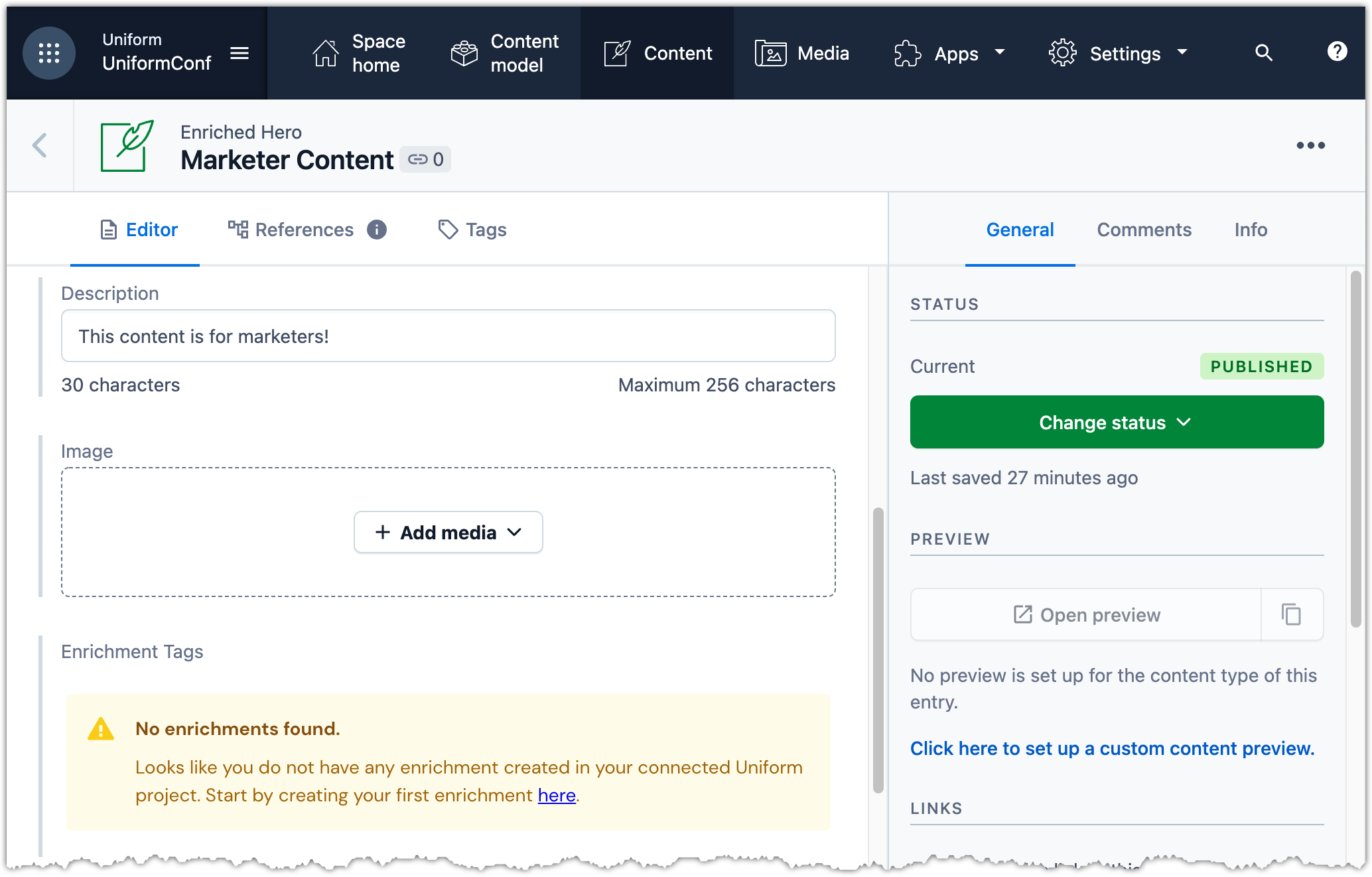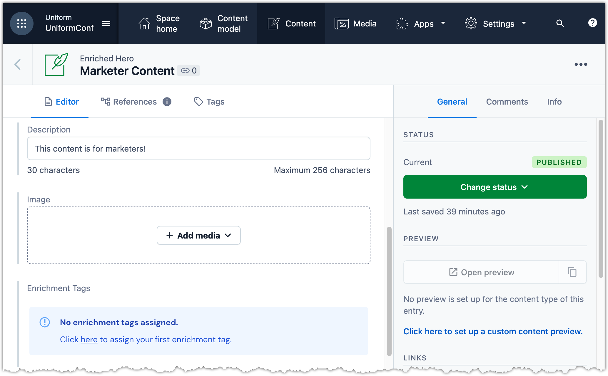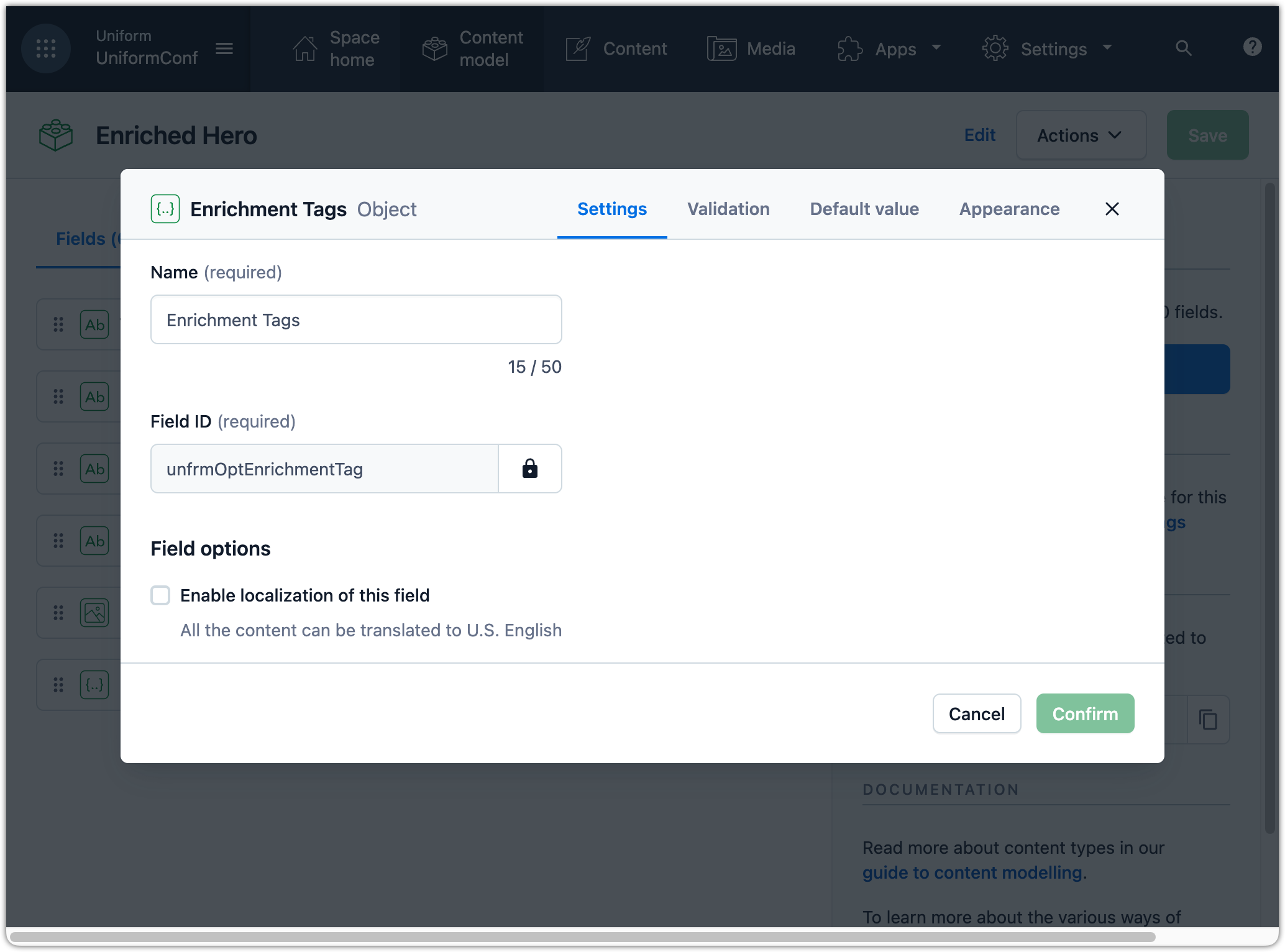 Open the content type Enriched Hero. Notice the field Enrichment Tags.