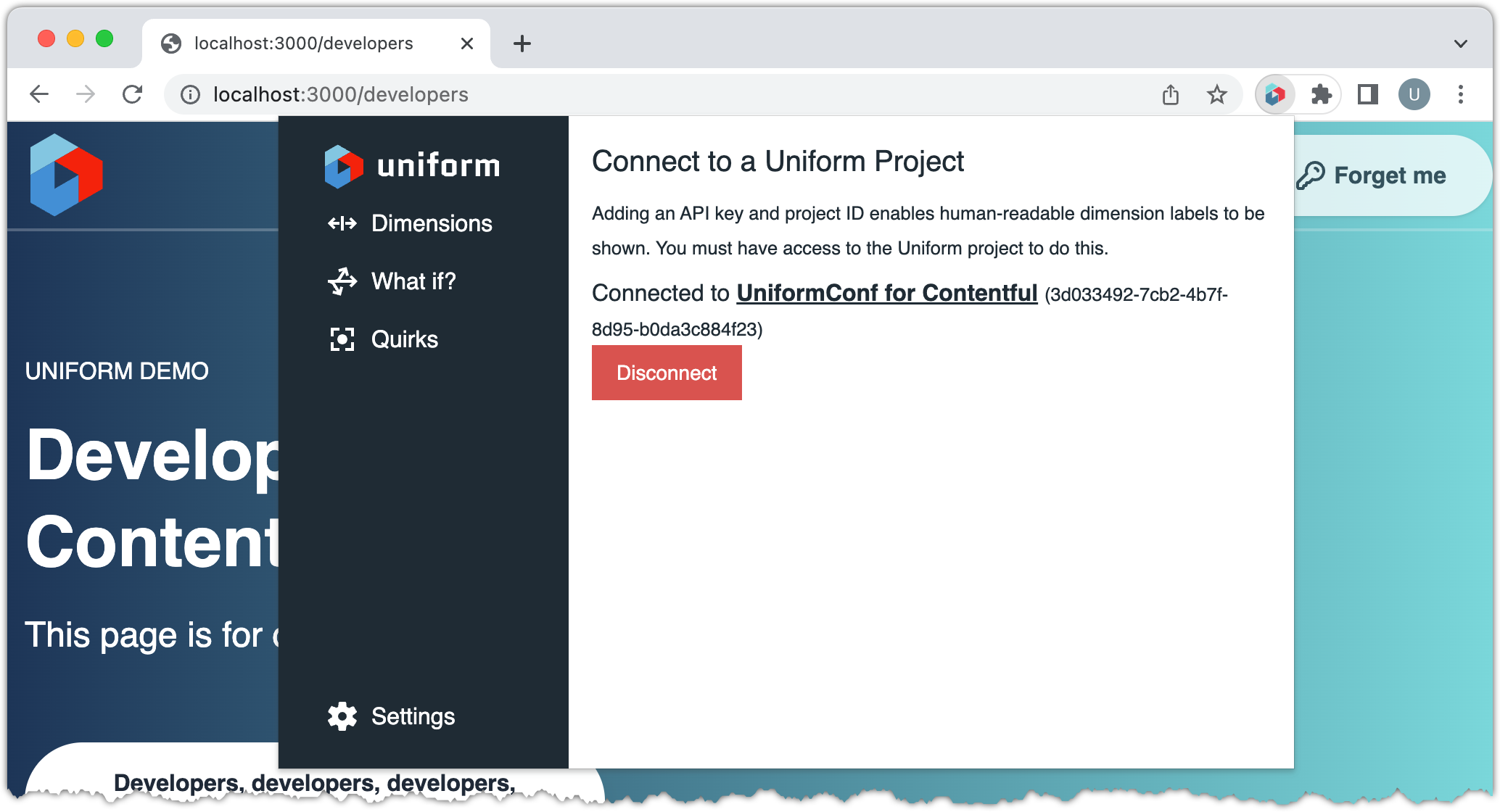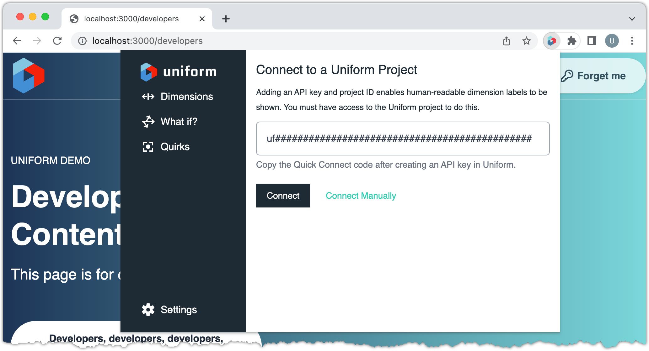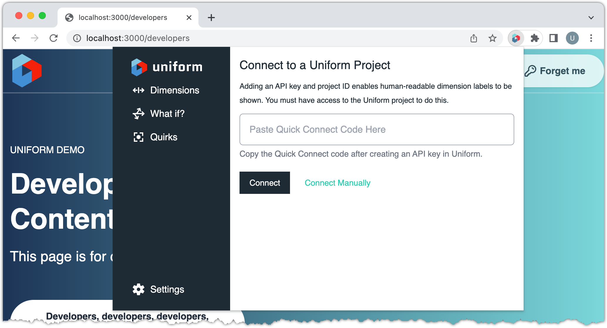 - Uniform Context browser extension - to facilitate development and testing personalization on the Next.js app. You can get the extension here. This is not required to use Uniform Context, but it makes development and testing much easier.