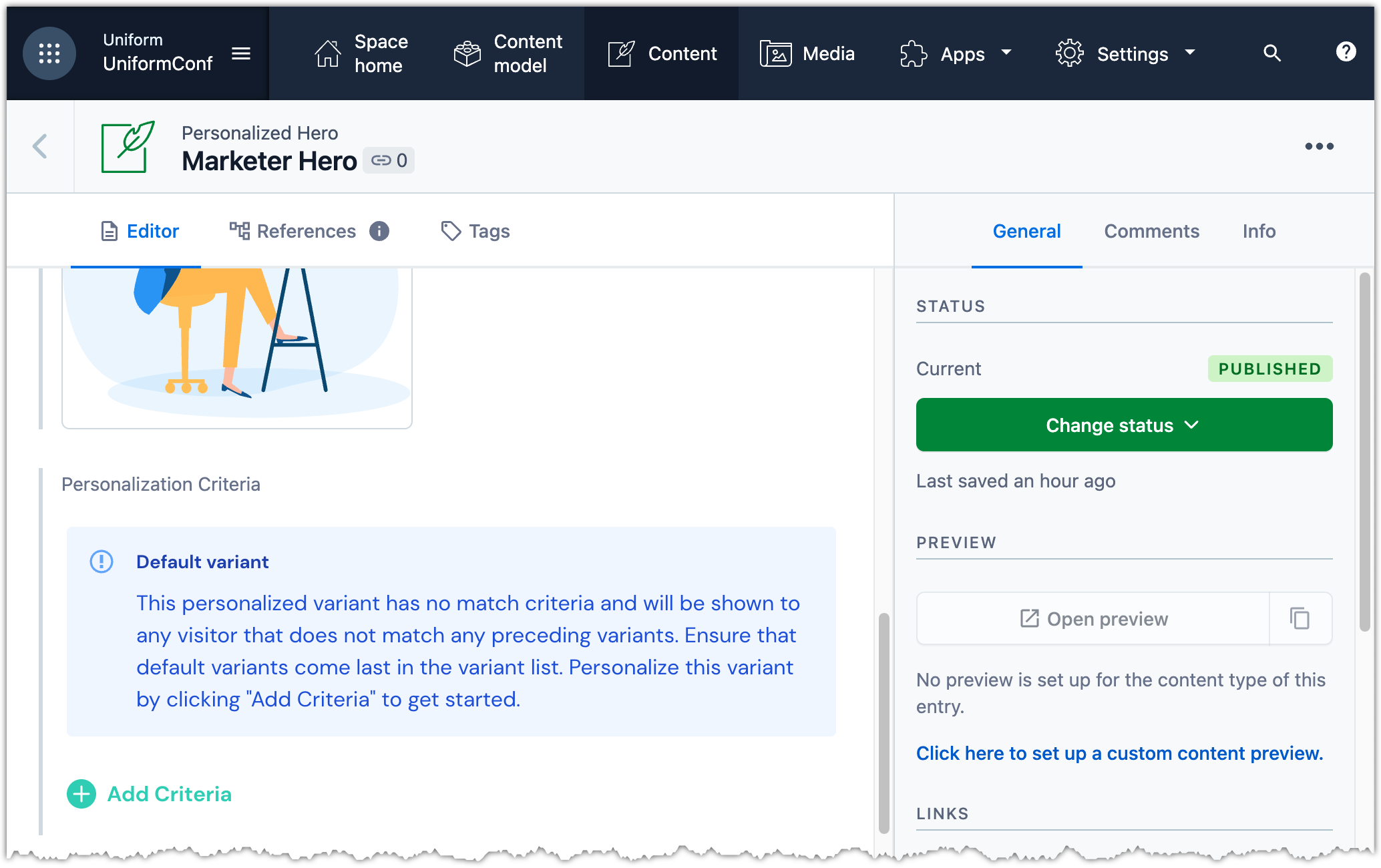 Open the content type Personalized Hero. Notice the field Personalization Criteria.