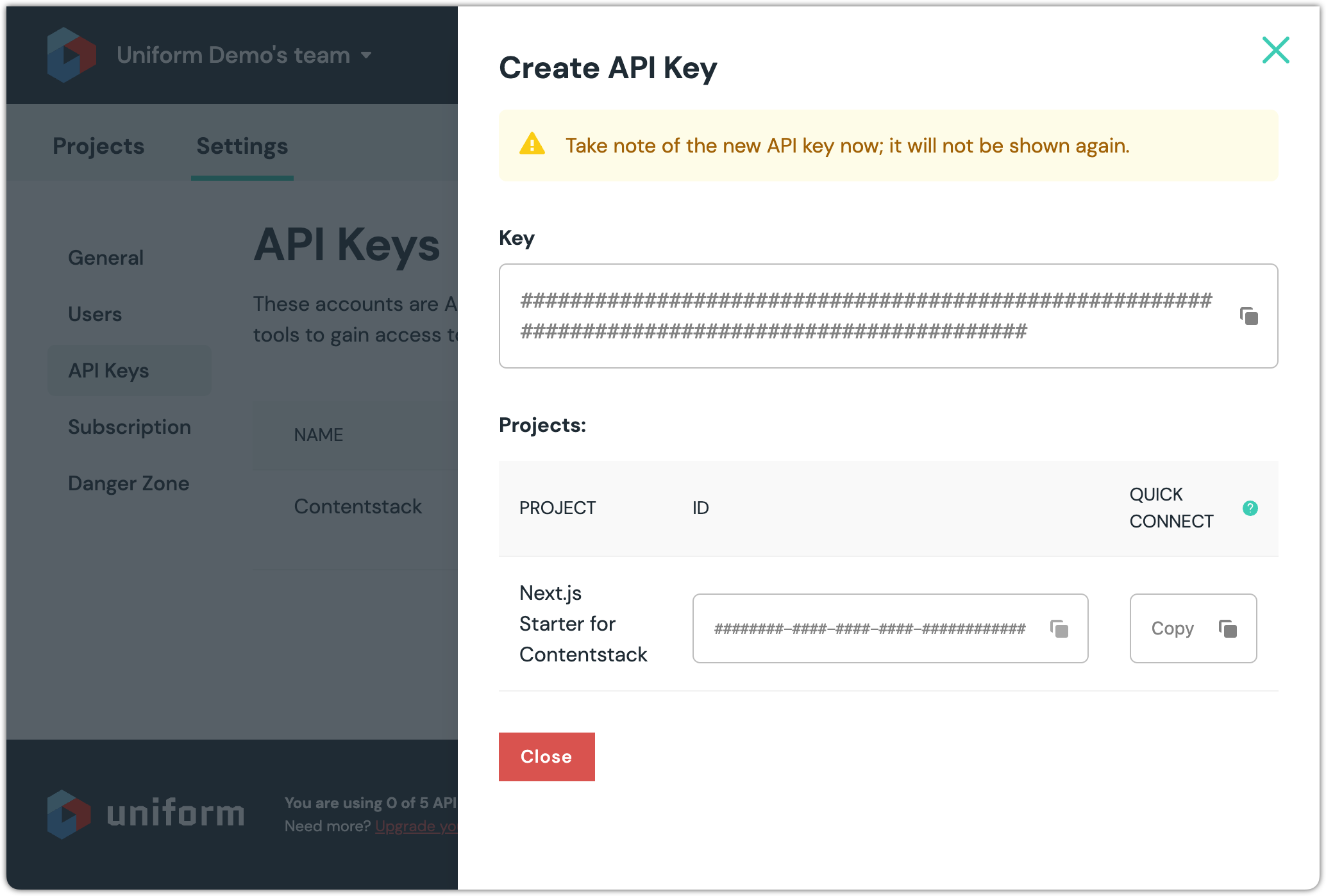 The value that is copied into your clipboard is the "Quick Connect API key". This includes several separate values in a single string to make it easier to configure connections to Uniform. This value is needed in the next section to configure the Uniform app in Contentstack.