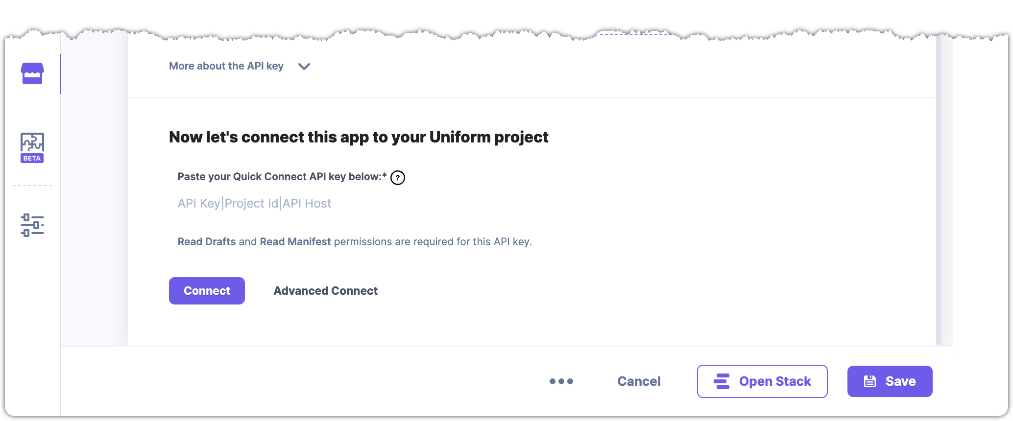 If the Quick Connect API key you entered is valid, you will see a message indicating the Marketplace app was able to connect to your Uniform project.