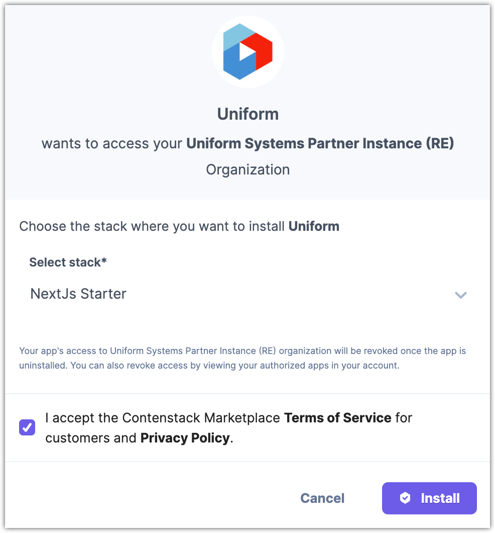 This section walks you through the process of adding the Uniform app from the Contentstack Marketplace to your stack and configuring it to be able to interact with your Uniform project.