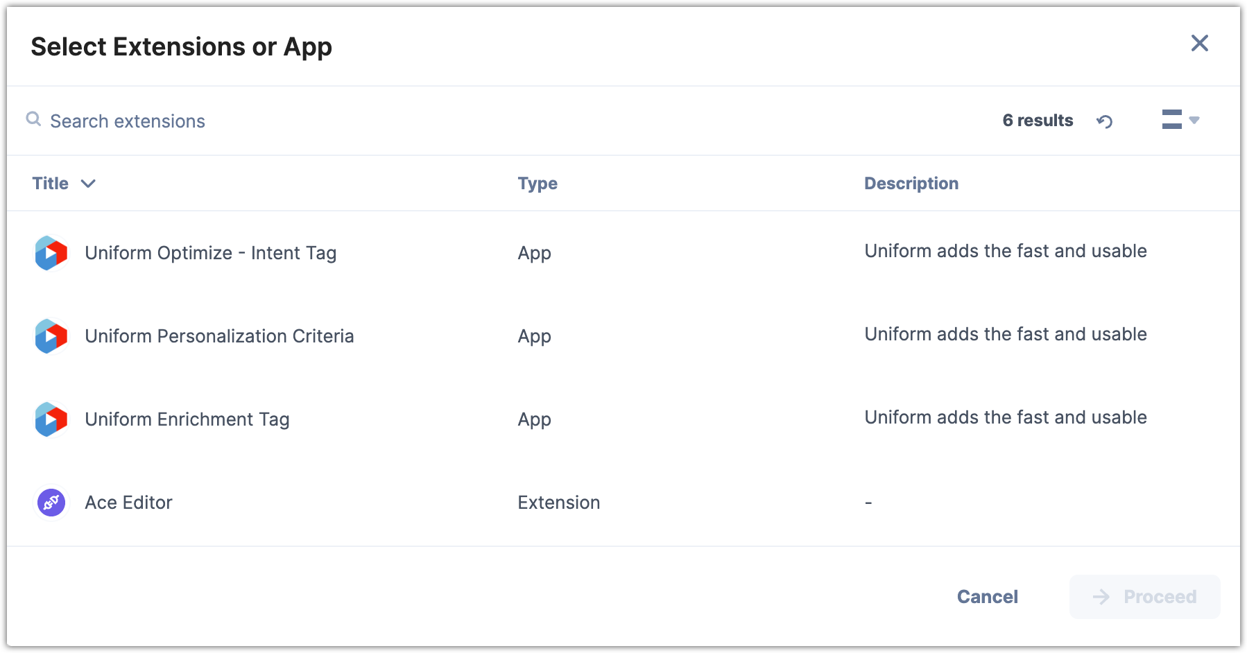 The Uniform app in the Contentstack Marketplace adds a number of custom field types that allow content authors to configure personalization during the content authoring process. You must add this app to your stack.