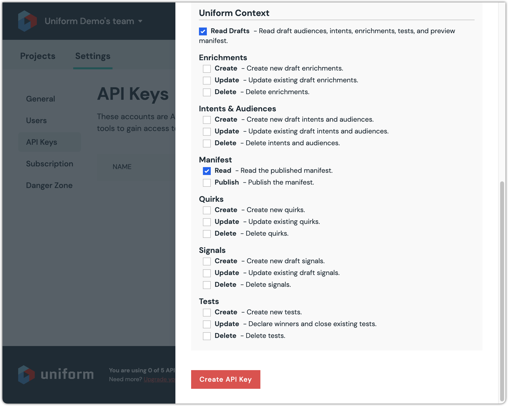 A Uniform API key is needed in order for the Marketplace app to read various settings involved with configuring personalization. In order to create a Uniform API key, you need administrator access to Uniform.