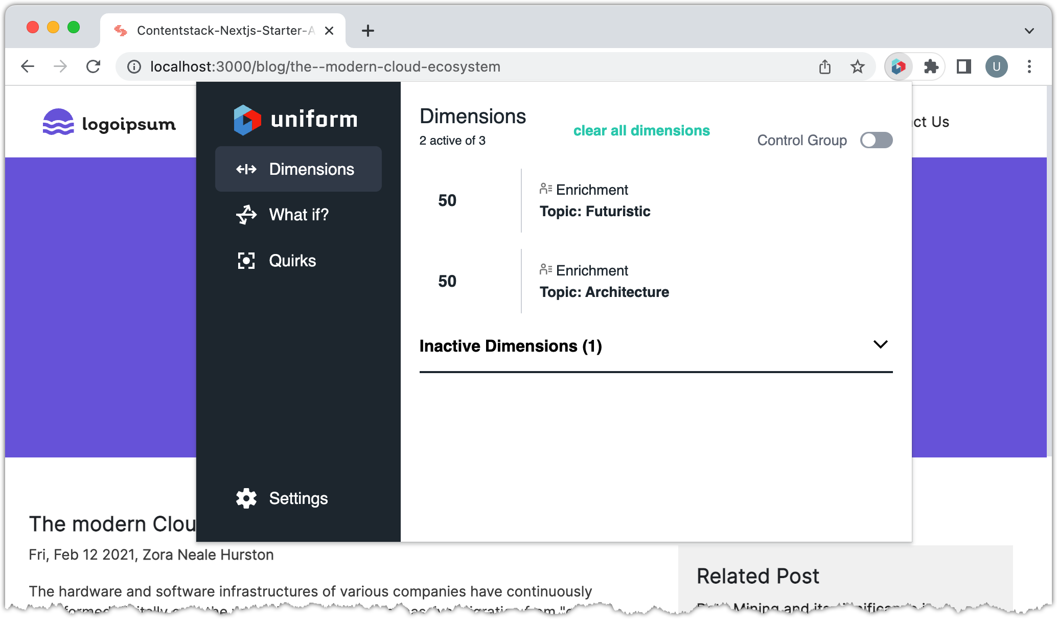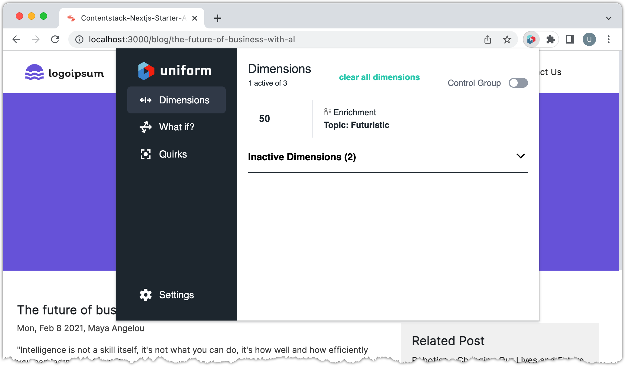 Now that you have a fully functional Next.js application powered with content from Contentstack and personalized using Uniform Context, you can use this as a starting point for exploring everything Uniform has to offer, including: