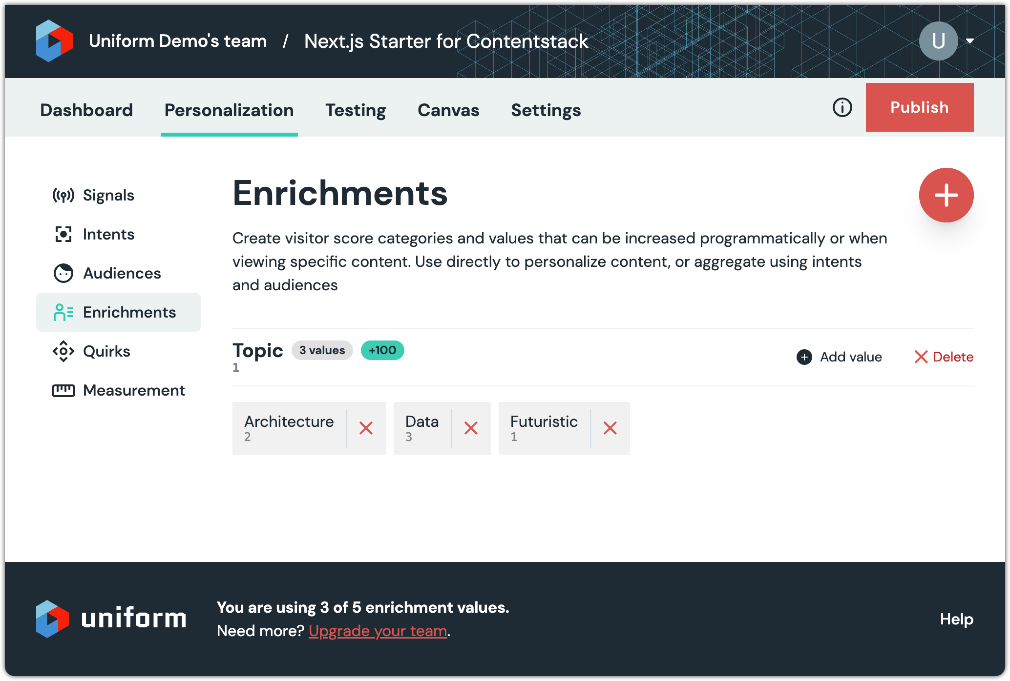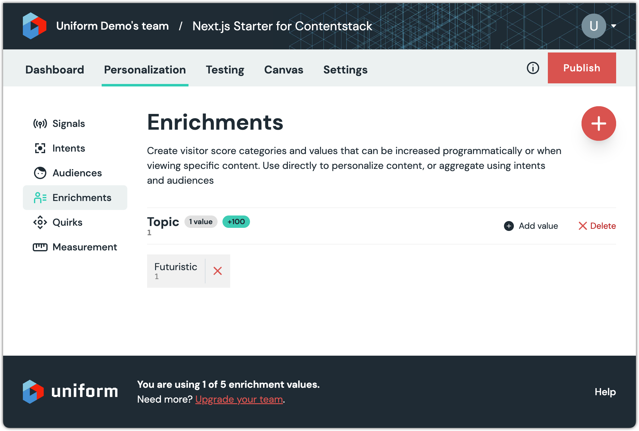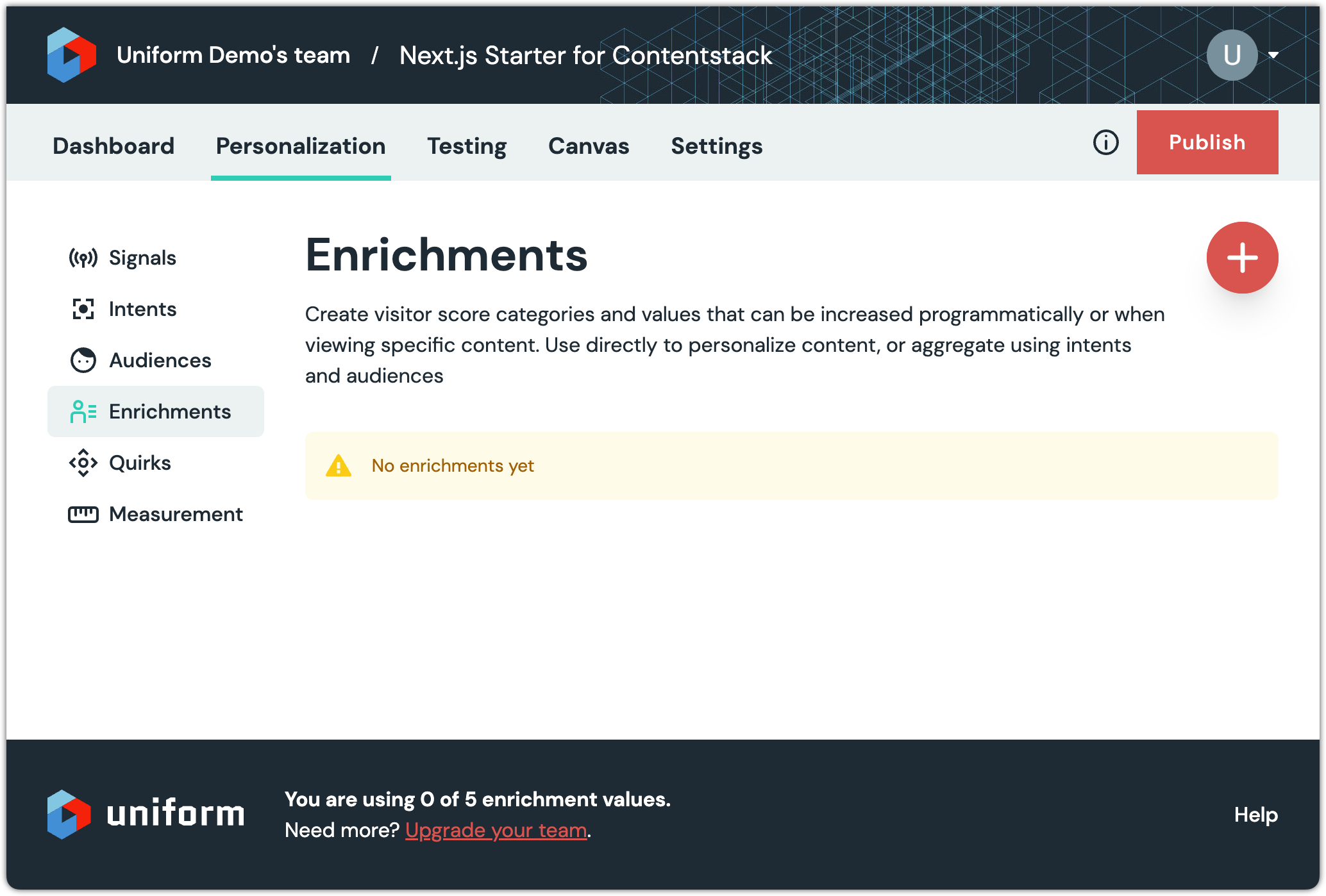 - Administrator access to Uniform - to configure the personalization settings that are available in Contentstack. If you do not already have a Uniform account, you can get a free one at https://uniform.app.