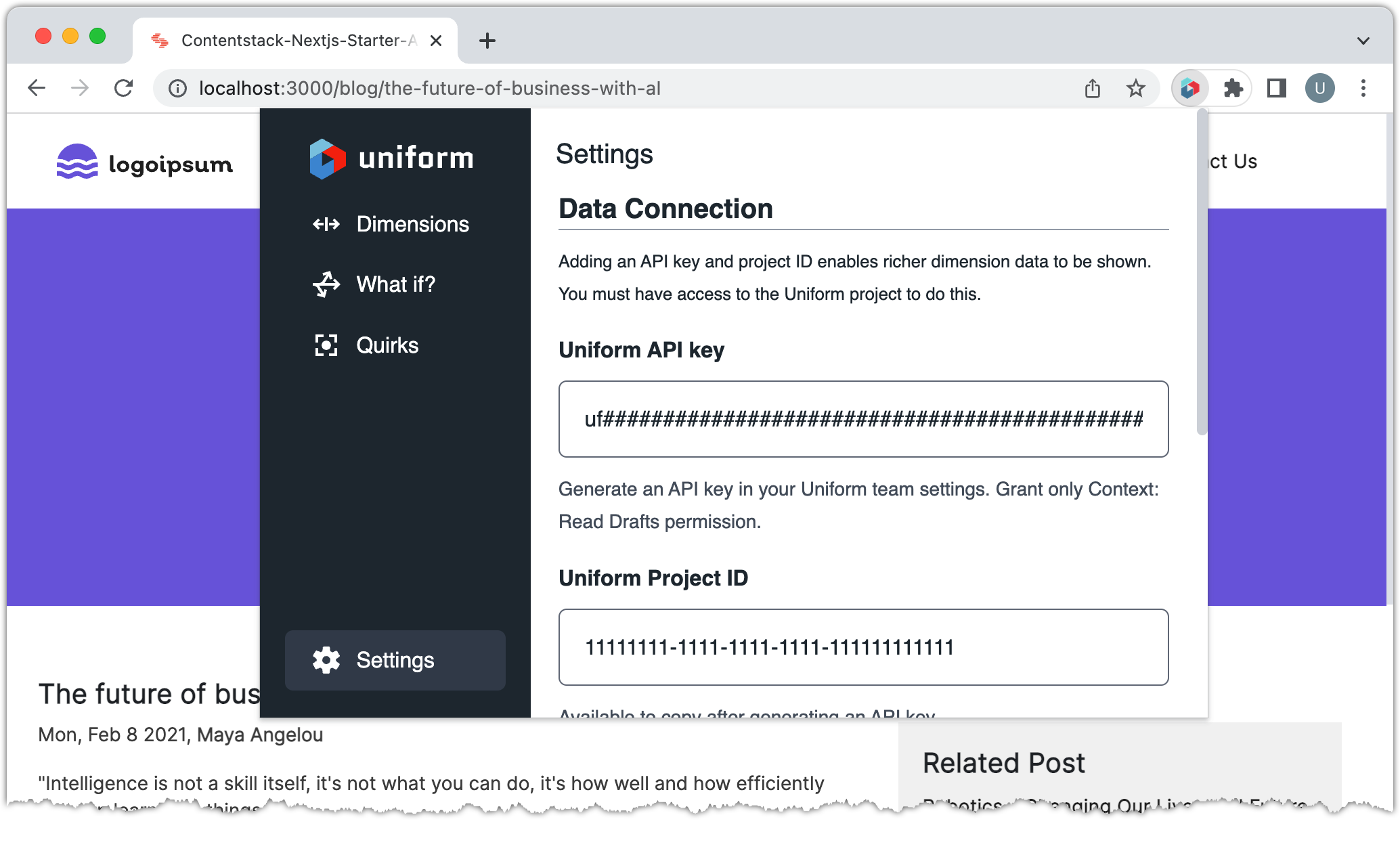 The Uniform app from the Contentstack Marketplace enables the personalization settings created in Uniform to be used in Contentstack. This app runs in Contentstack, so it must be able to communicate with Uniform. It uses a Uniform API key to do this. You must create this API key.