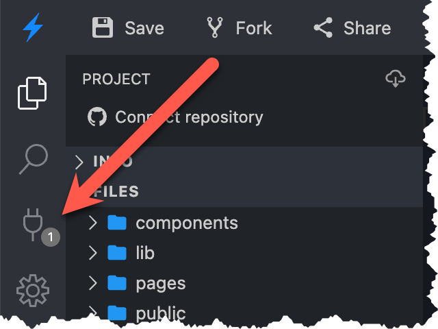 .envfile should cause the container to restart. If it doesn't, enter the following command in the Stackblitz terminal:npm run devIn the activity bar the plug icon indicates that 1 port is in use. Click this icon.
