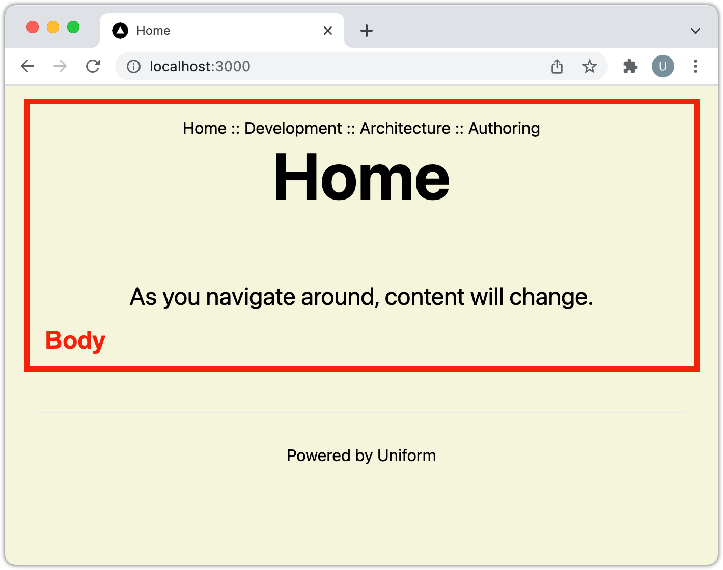 The default page component is a composition component. This component represents a page on the site that a business user can add a Default Body component to.