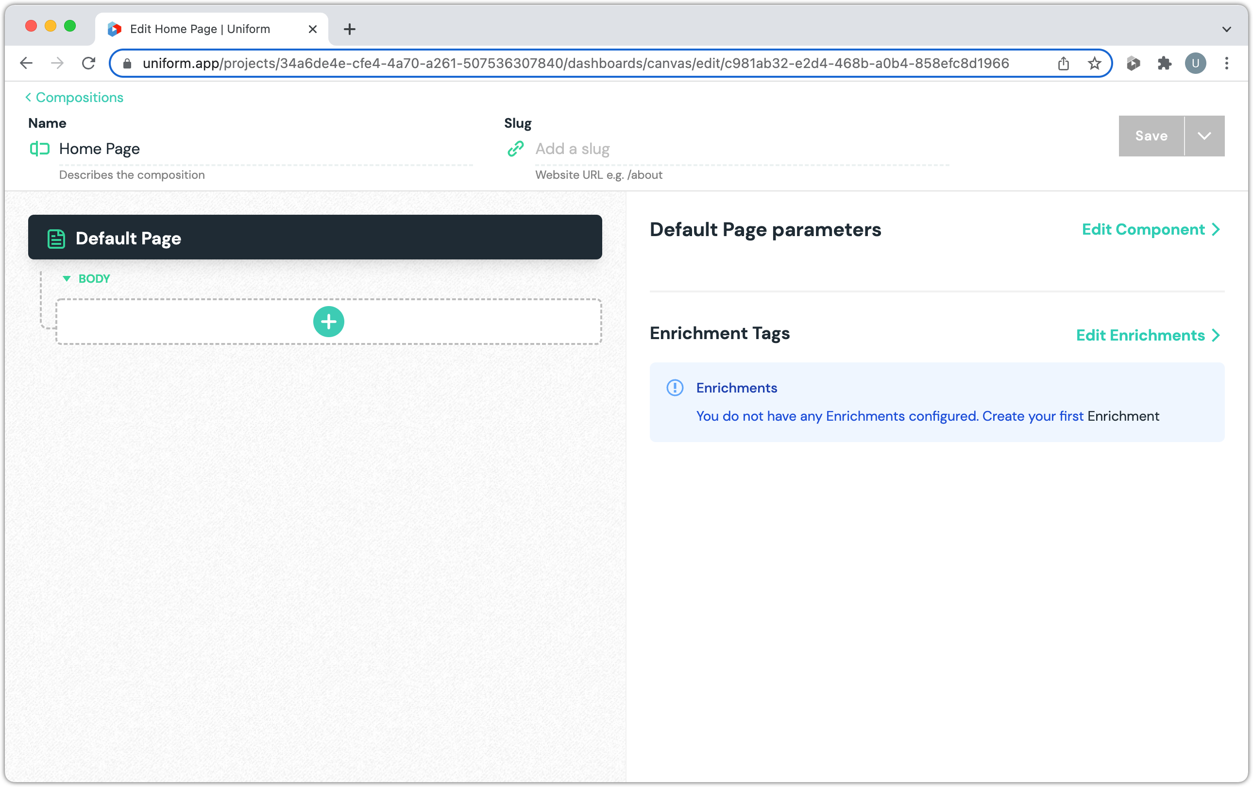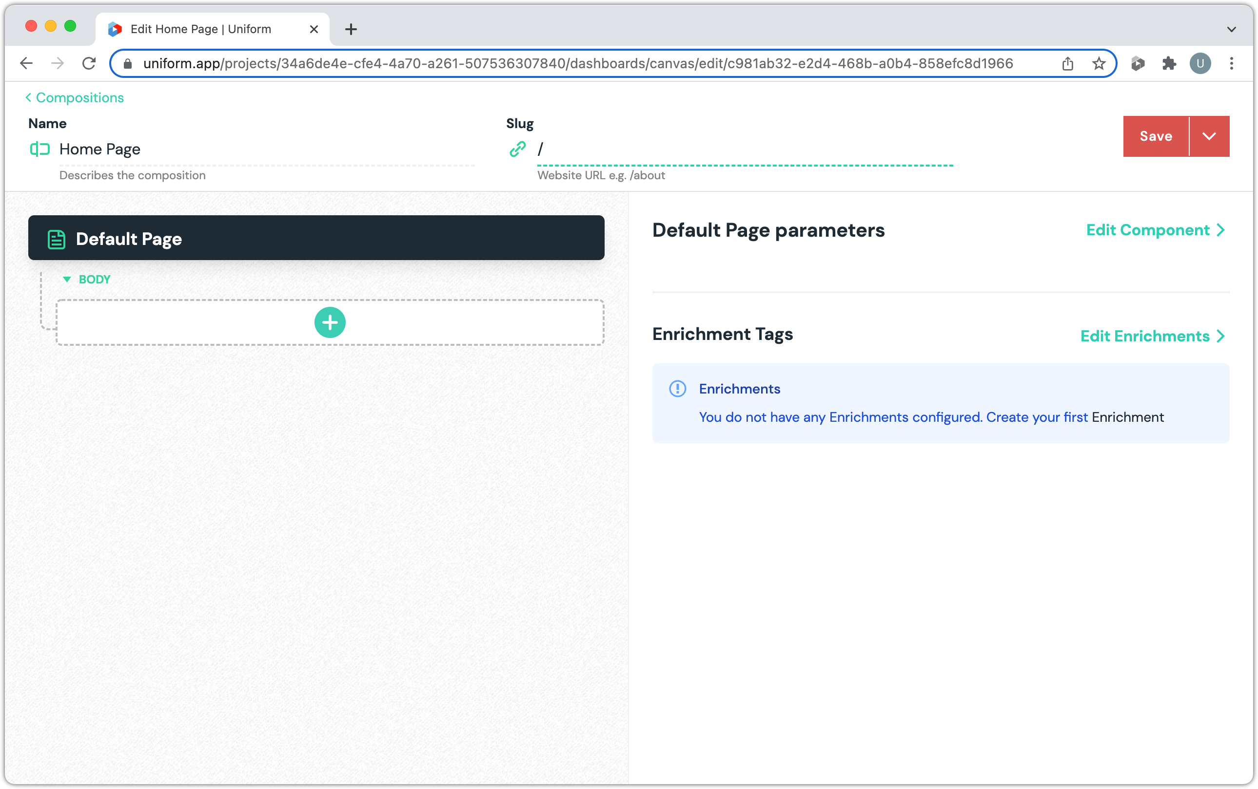 The slug is the value the front-end logic will use to retrieve the details about the composition. Don't be confused by the value being /. The value could just as easily have been "home" or "home page". As long as the front-end logic uses the same value, the slug can be whatever you want.