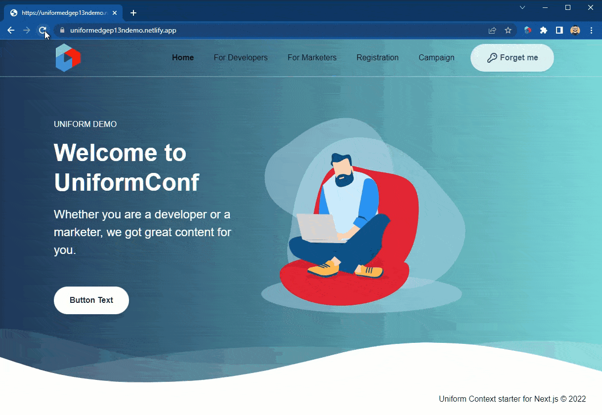 - Click Forget me to reset the Uniform signal scores. Visit For marketers and return to the home page, notice a different variant. This is personalization based on behavior collected at the edge.